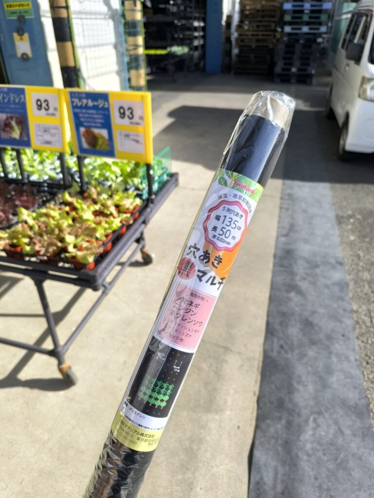 穴あきマルチ。黒色のマルチは地温を上げてくれるので冬場までの成長と春先の肥大に